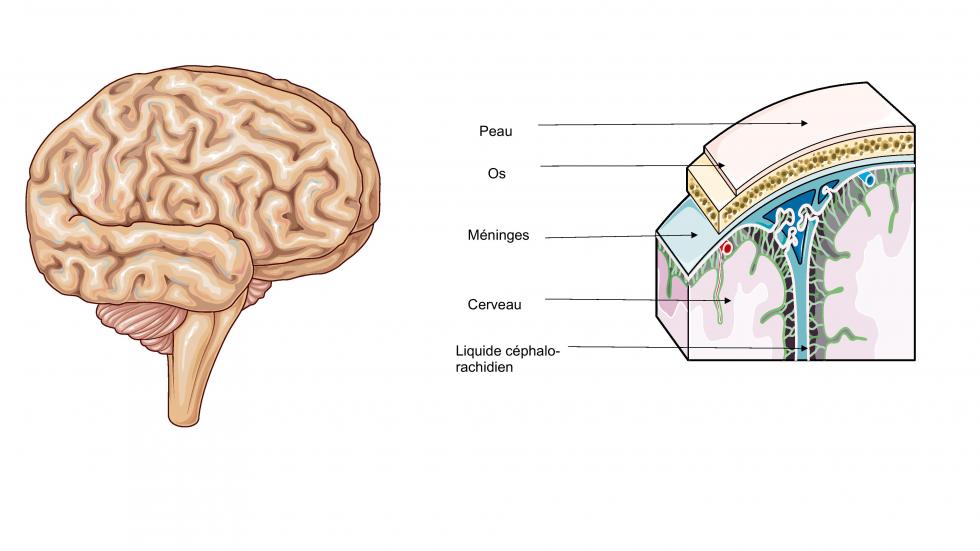 Le cerveau est entouré par les méninges et la boîte crânienne qui constituent une barrière de protection. Le cervelet, situé sous le cerveau, joue un rôle dans l’équilibre et la coordination des mouvements. Le tronc cérébral relie le cervelet à la moelle épinière.